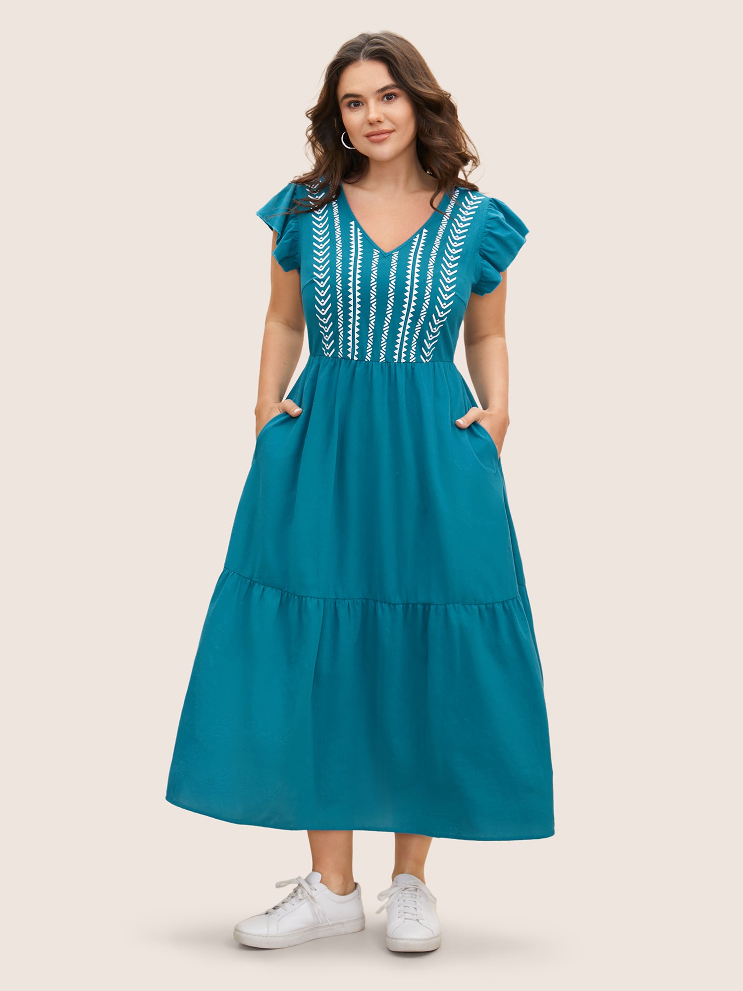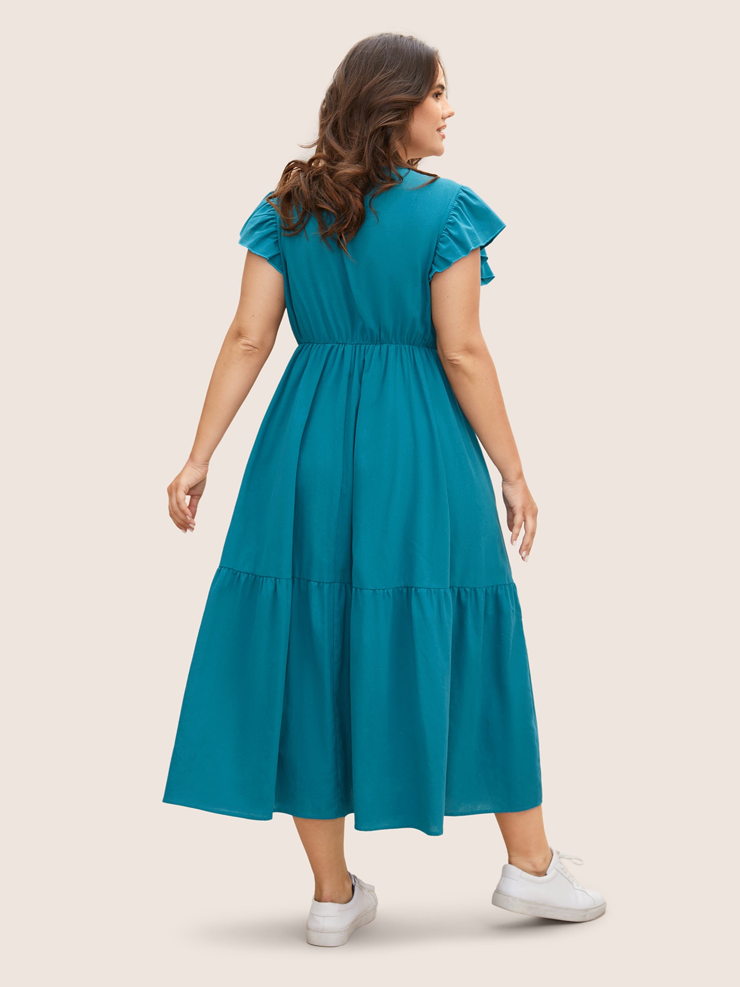 • Bandana Geometric Ruffle Cap Sleeve Midi Dress