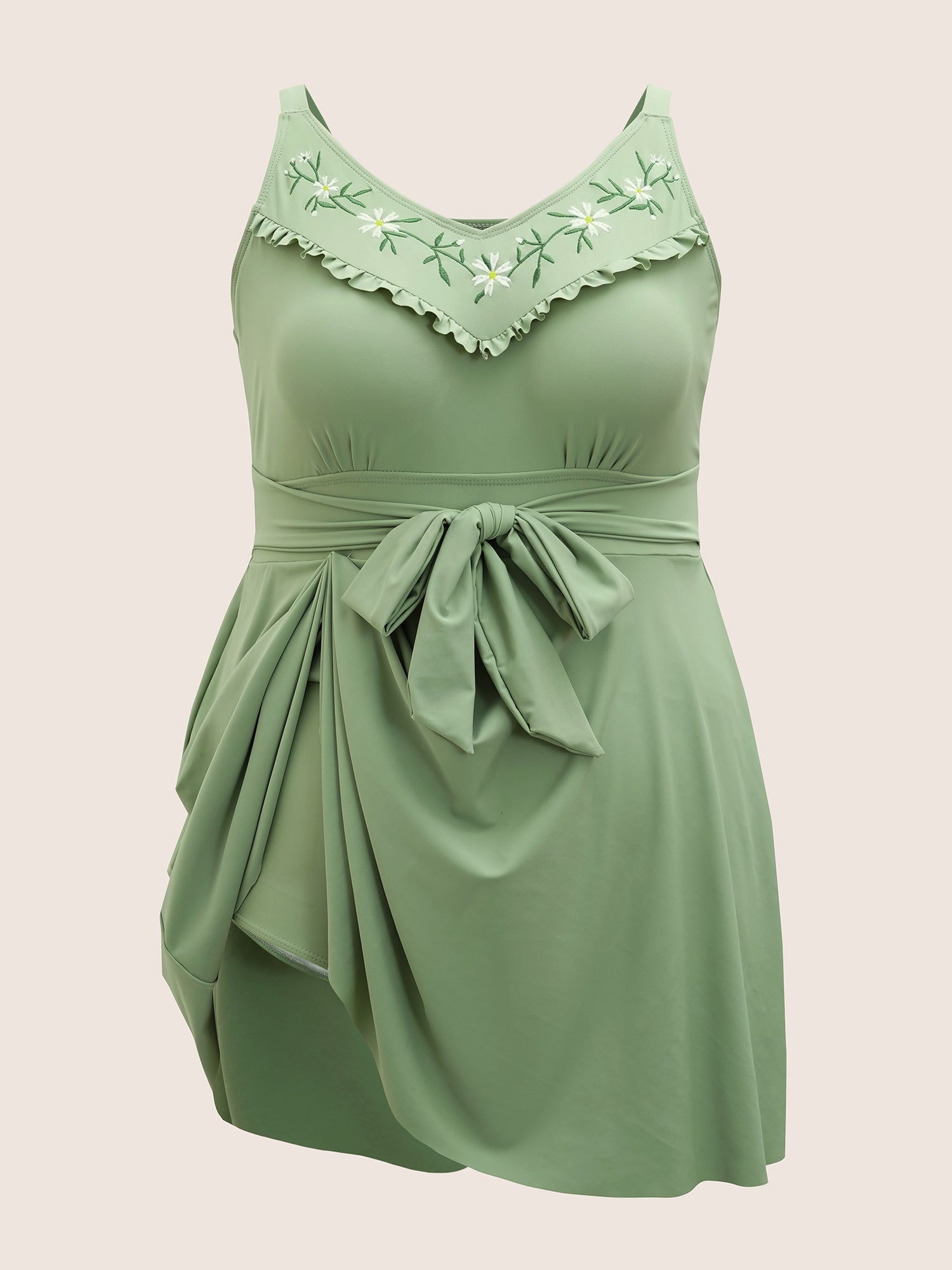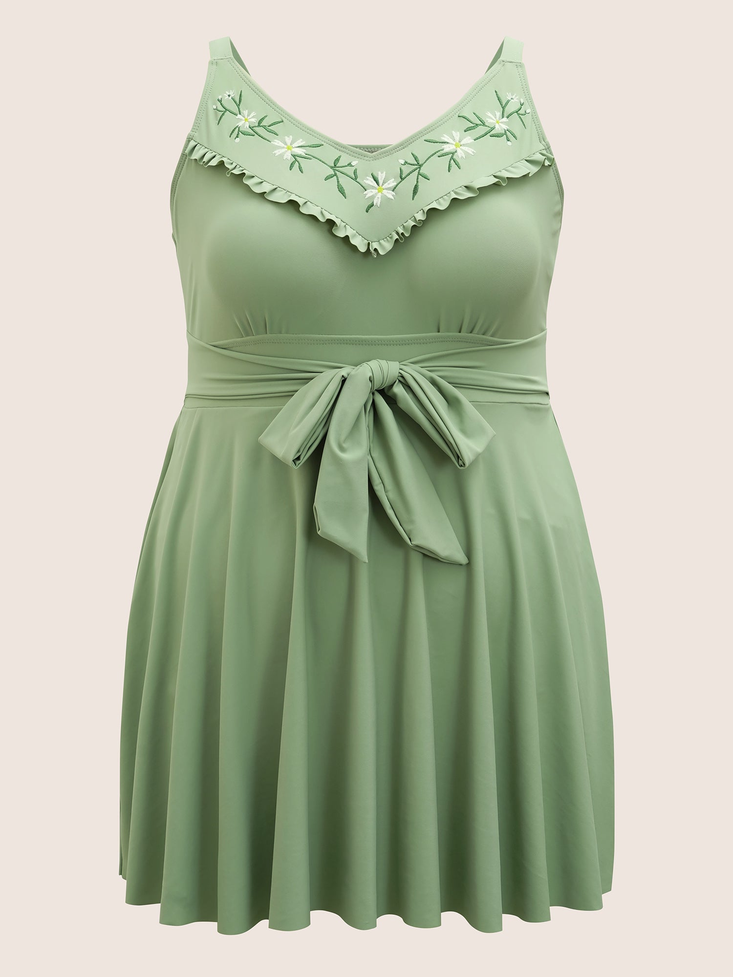 Floral Embroidered Frill Trim Tie knot Swim Dress