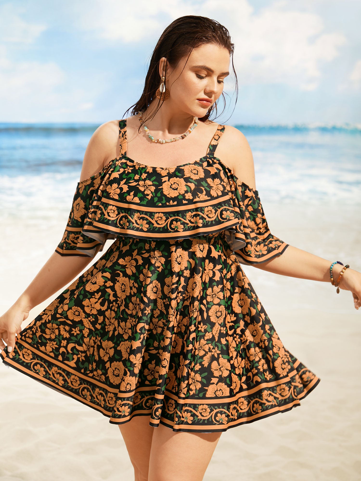 • Floral One Shoulder Neck Ruffles Swim Dress