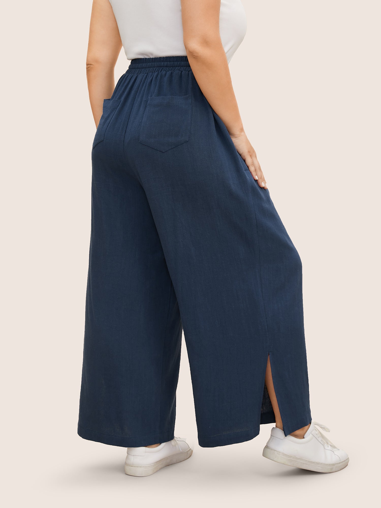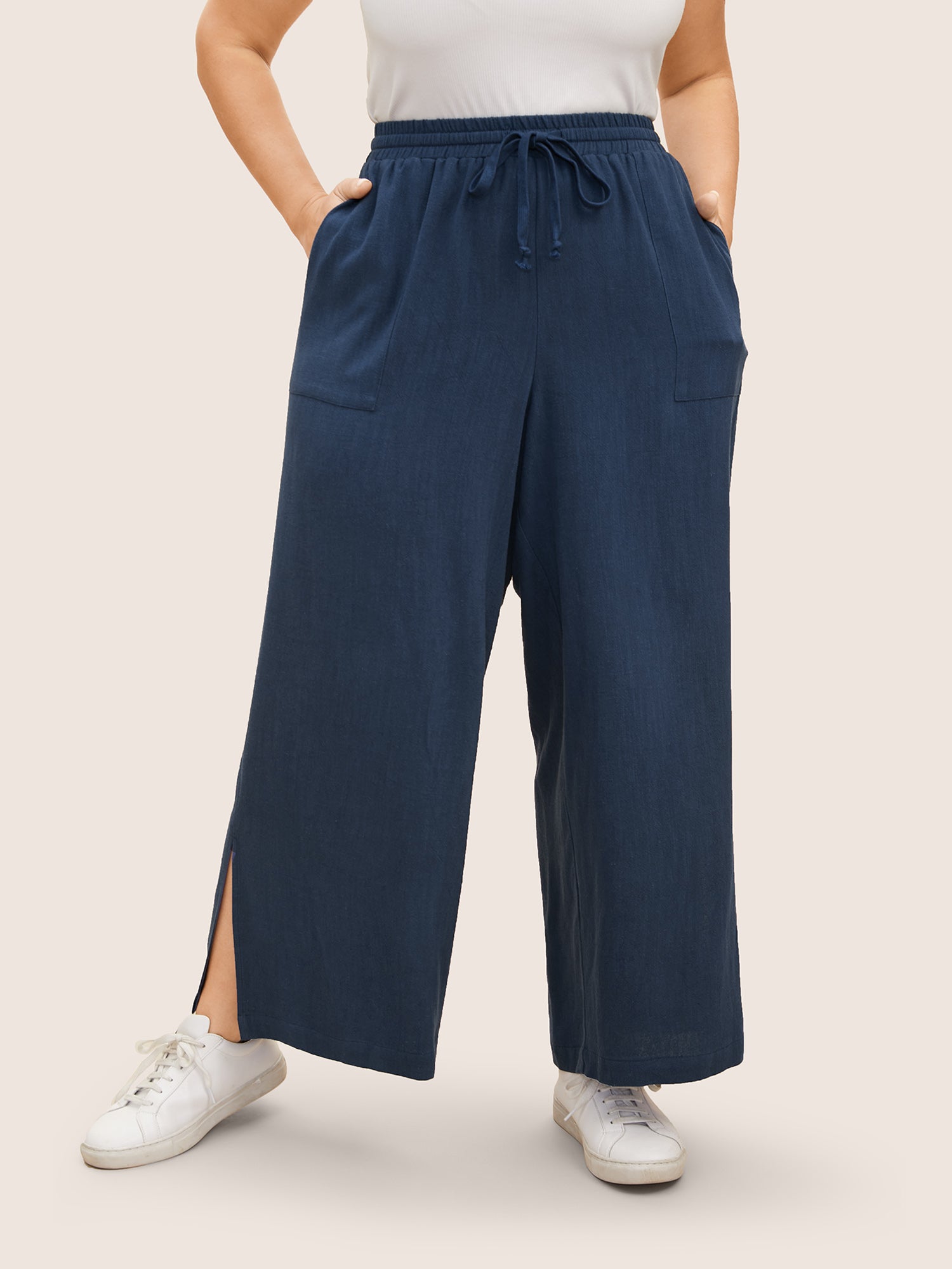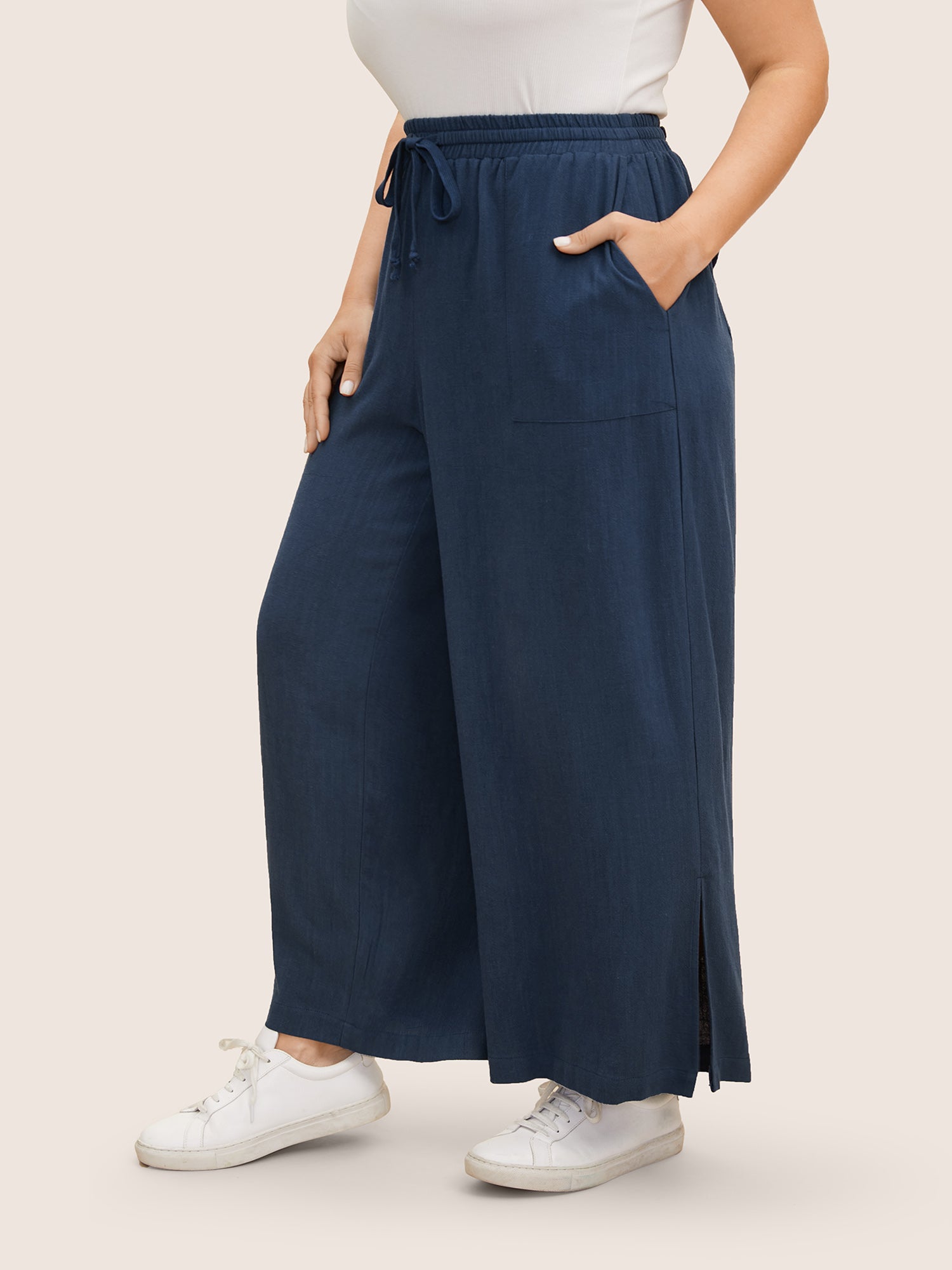 • Cotton Linen Drawstring Split Hem Wide Leg Pants