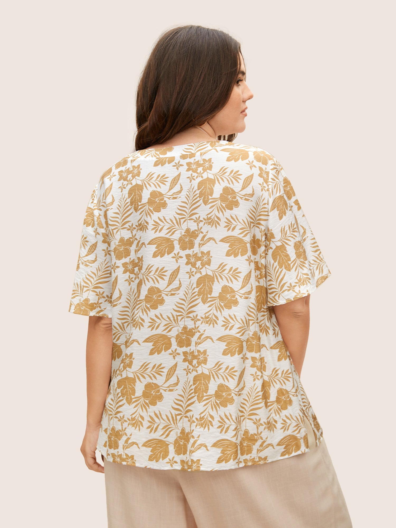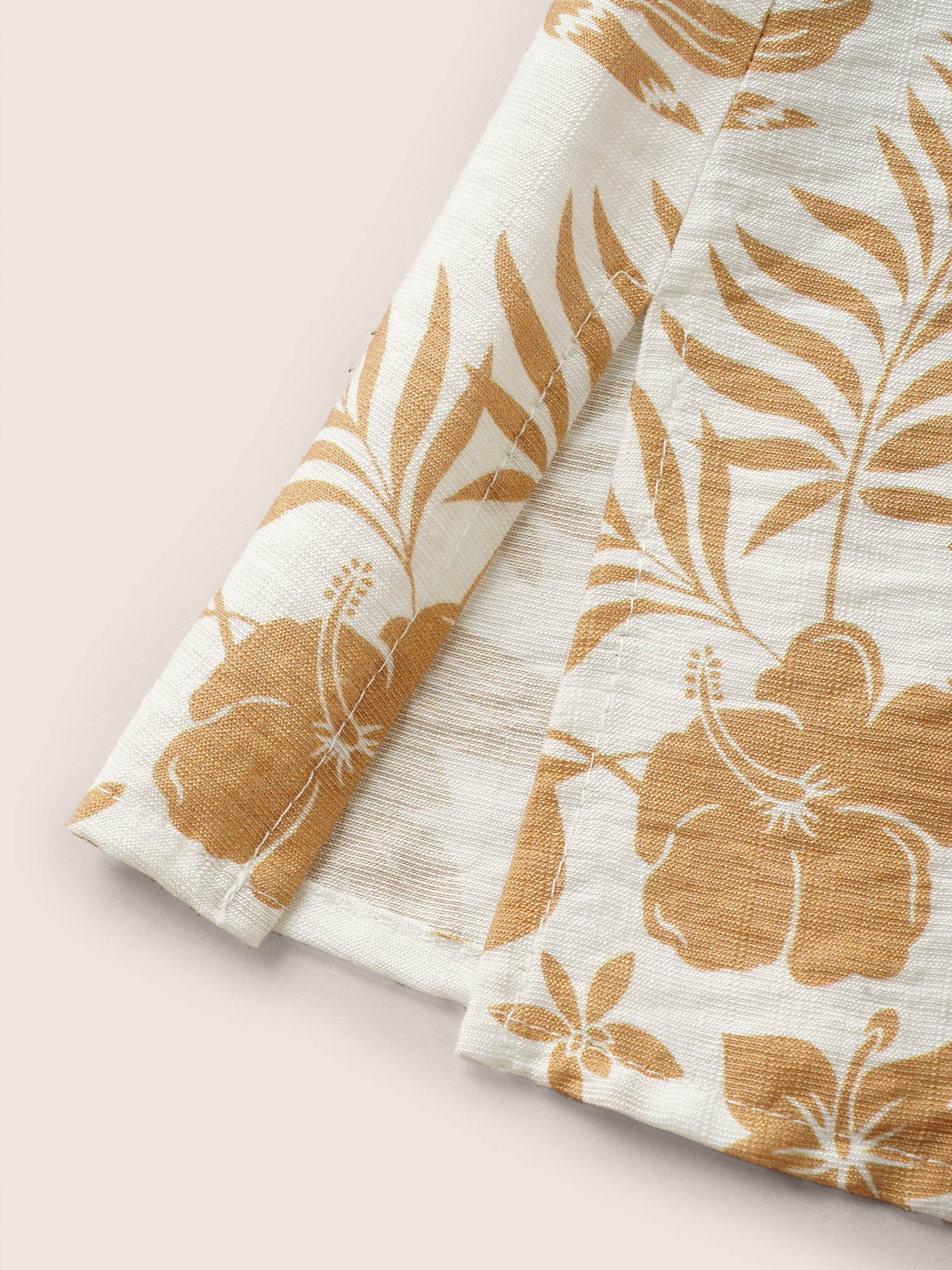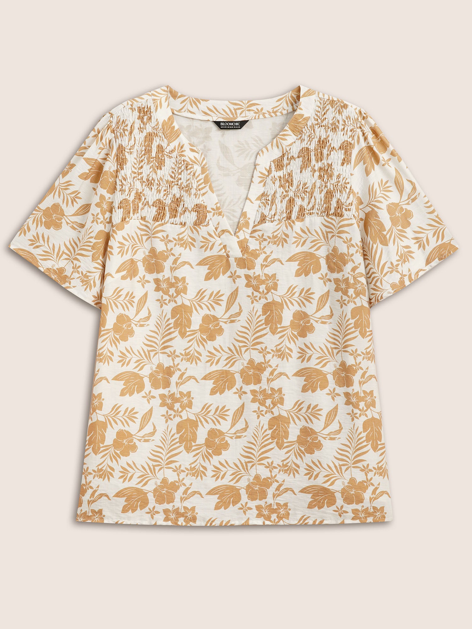 • Cotton Linen Floral Notched Collar Shirred Blouse
